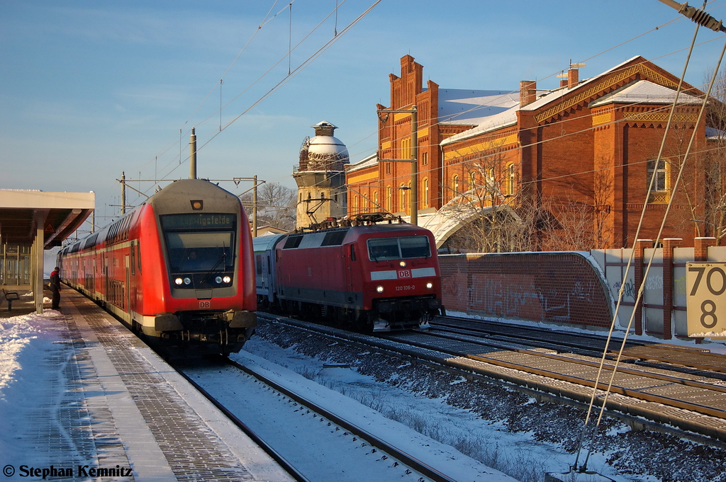 120 134-2 mit dem IC 1193 von Berlin Südkreuz nach Frankfurt(Main)Hbf, bei der Durchfahrt in Rathenow. Die 120 138-3 hatte den Intercity nachgeschoben. 17.01.2014