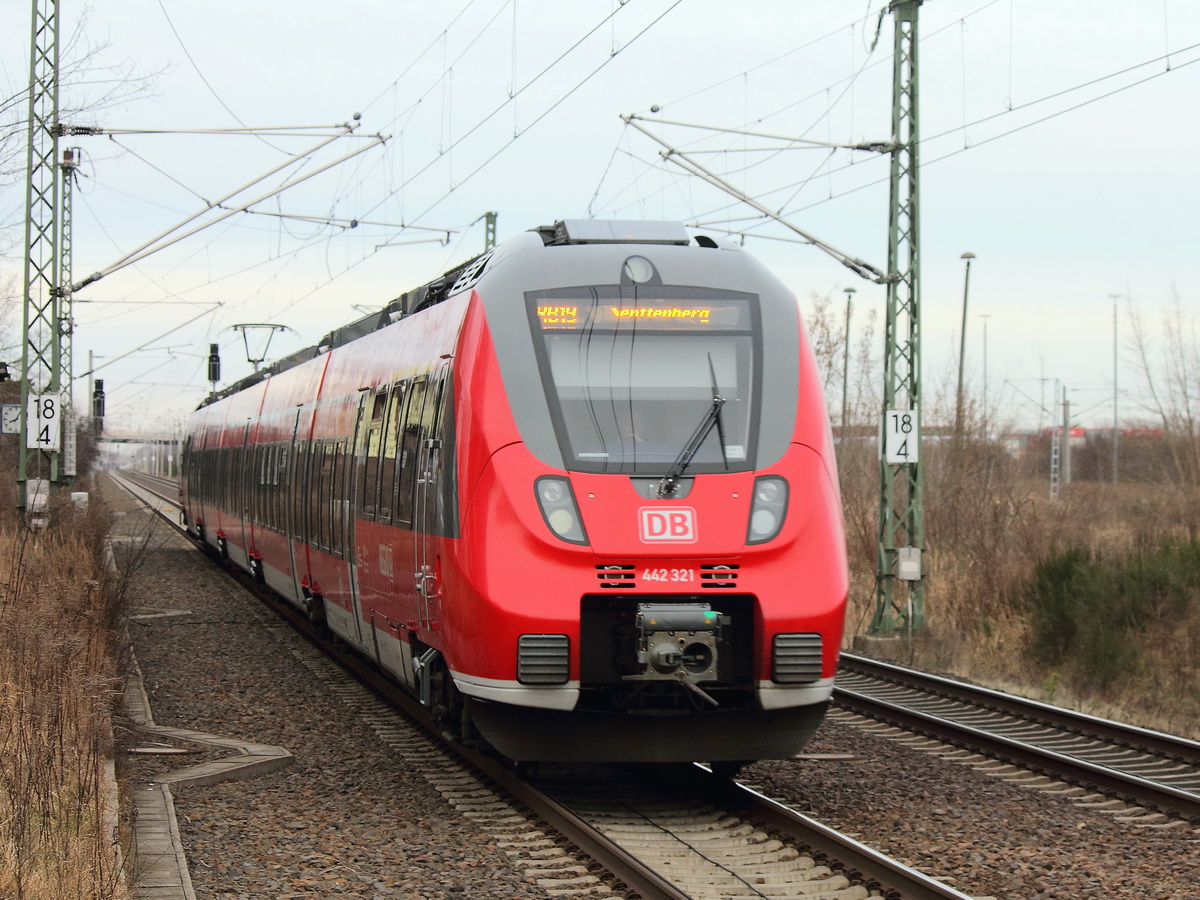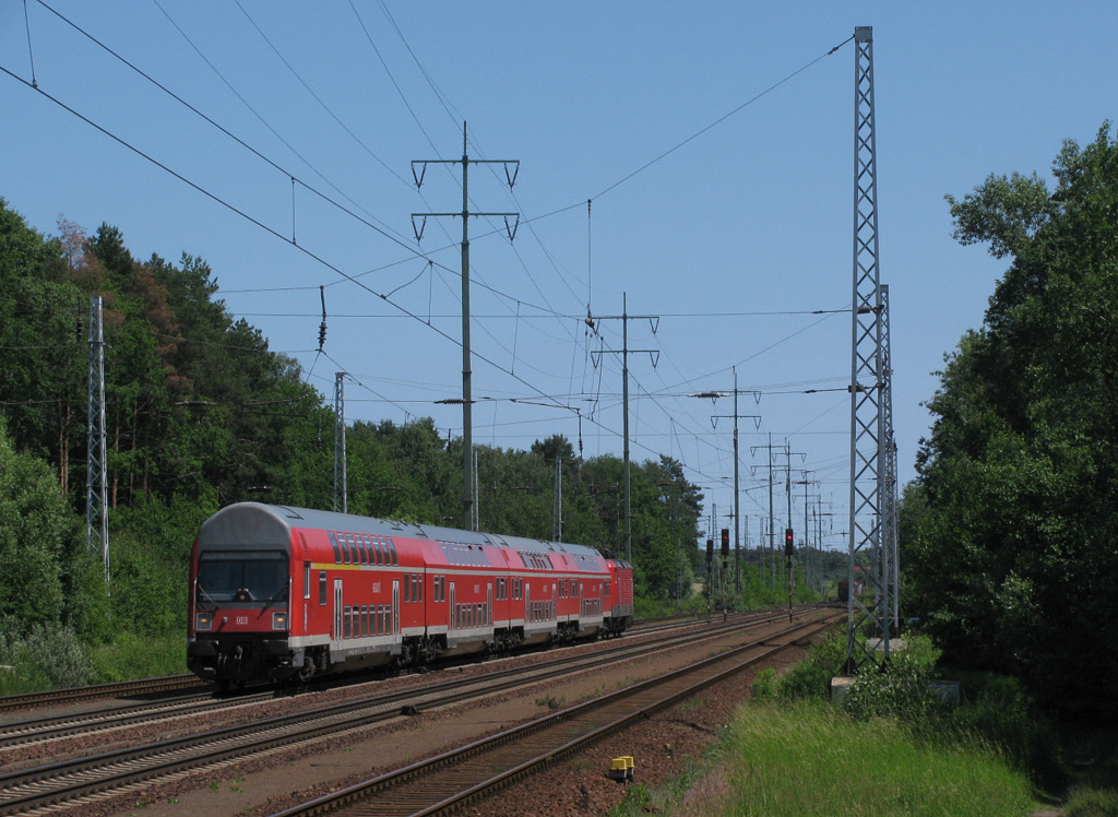 Mal mit dem Zoom gespielt: 143 802 (Leihlok aus Stuttgart) schiebt hier einen aus Magdeburg geliehenen Steuerwagen als RB 21 nach Wustermark. 29.04.2011